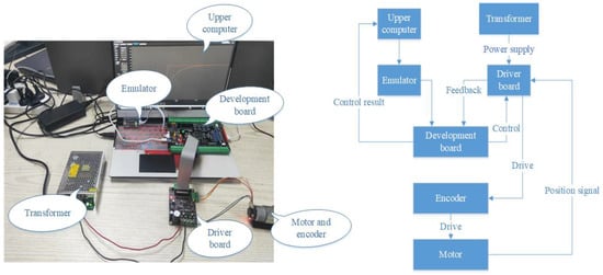 To optimize motor corner control, this paper introduces the FOPID control algorithm to replace the traditional PID control algorithm and verifies the excellent performance of the FOPID control algorithm in motor corner control through simulation and test results. In the actual implementation, this paper chooses the STM32–F407 development board as the carrier of the control algorithm and uses Keil uVision5 to write PID and FOPID control programs in the upper computer and set the initial parameters of the controller. The control driver board is powered by a transformer, which drives the motor through an encoder. The Hall sensor on the driver board is responsible for acquiring the position signal of the motor and feeding it back to the development board. The development board then controls the angle of the motor in real time and feeds the control results to the host computer for display. Figure 14 shows the information about the test equipment and the test flow.