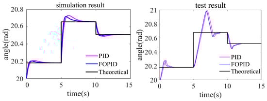 As shown in the figure, both the simulation result and test result indicate that the FOPID control represented by the blue curve achieves the desired motor angle faster than the PID control represented by the purple curve. In the simulation result, when facing sudden changes in angle, the overshoot of the simulation curve is small, and steady state is achieved within 2.5–3 s. However, in the test result, there is significant overshoot and oscillation, especially during the 5-s angle adjustment with a large step change, which results in a long time to achieve steady state. Nevertheless, compared to the traditional PID controller, the FOPID controller exhibits faster response, smaller overshoot, and shorter steady state time in controlling motor angle.