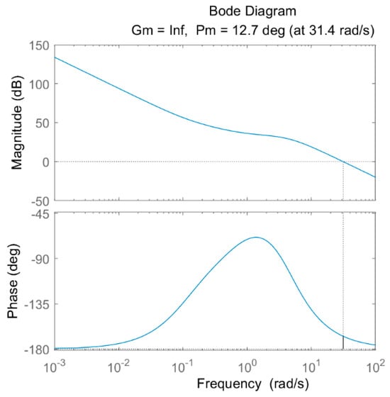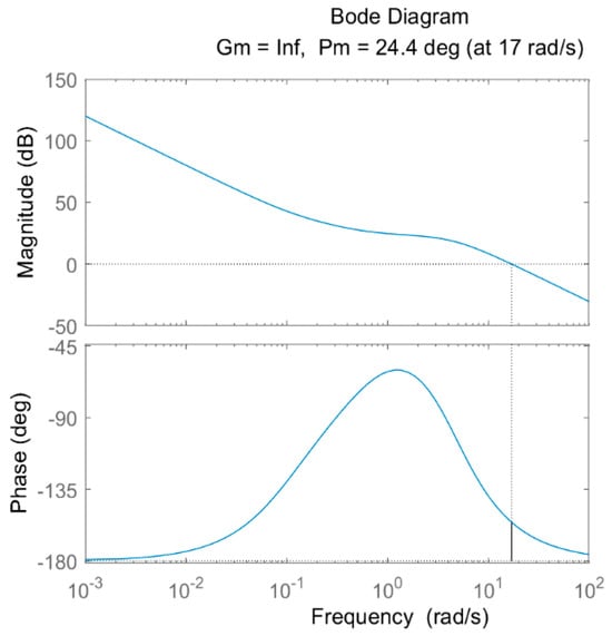 To address the above problem of error between simulation and test, the stability of the system when the system is subjected to external disturbances and errors is analyzed by plotting the Bode plots of the controllers. According to the flowchart and transfer function equation in Figure 8, the values in Table 3 and Table 4 are brought into the solution to obtain the Bode plots of the PID and FOPID controllers, as shown in Figure 16 and Figure 17.