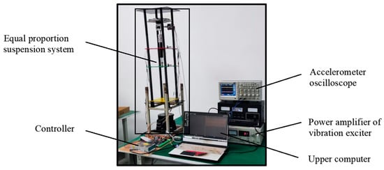 where is the reference spatial frequency, = 0.1 m−1; is the road surface unevenness coefficient; is the space under the cut-off frequency, = 0.1 Hz; is the vehicle speed of 50 km/h. Since the amplitude range of the shaker in the experimental equipment is 0–0.01 m, is taken as 0.04 unit intensity of Gaussian white noise.