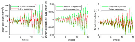 Before proceeding to the active suspension control study, the accuracy of the used fractional-order nonlinear passive suspension model is demonstrated. Usually, passive suspension models assume that damping is a linear fixed value, while models that consider fractional-order nonlinear characteristics should be closer to the true value. At this point, b = 1, the body acceleration, suspension dynamic deflection, and tire dynamic load under simulation and test were obtained, as shown in Figure 12 and Figure 13 below.