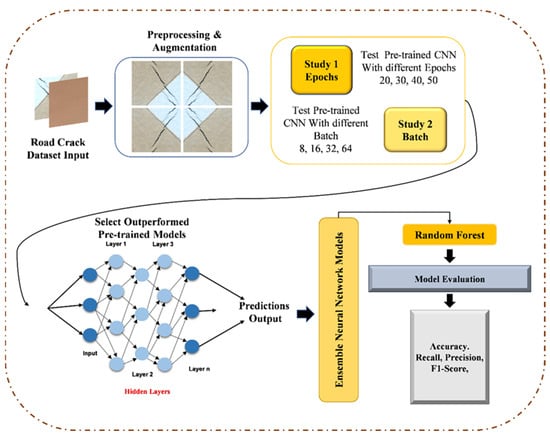 In our pursuit of optimal performance, we explore various machine learning techniques utilizing these stacked features to classify road data (crack vs. non-crack) for autonomous vehicles. Subsequently, we train a classifier, such as a Random Forest, on the stacked feature representations using the training dataset, with the validation set aiding in fine-tuning hyperparameters to achieve peak efficiency. The evaluation phase is paramount, where we meticulously assess the proposed model’s accuracy, precision, recall, F1 Score, and other pertinent metrics on the test dataset. We experiment with different stacking techniques for further performance enhancements and delve into ensemble learning approaches like bagging, boosting, Min Ensemble, Max Ensemble, and Average Ensemble. Employing cross-validation ensures the model’s robustness and its capacity for generalization. Upon achieving the desired accuracy, our model is poised for real-world deployment in road maintenance and safety monitoring applications. By effectively harnessing the combined capabilities of Xception, MobileNet, InceptionV3, and Random Forest, we deliver a potent solution for accurate crack detection in road infrastructure. Figure 2 presents overview of proposed architecture diagram.
