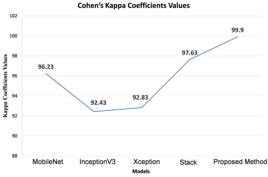 Cohen’s Kappa coefficient comparison between baselines, stack, and proposed model.