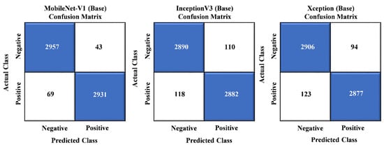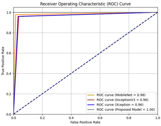 The performance of each base model was assessed by evaluating their sensitivity and specificity rates through the ROC curve, as depicted in Figure 4. The results indicated that the MobileNet, InceptionV3, and Xception baseline models outperformed the original baseline models, achieving AUROCs of 0.98, 0.96, and 0.96, respectively. Our models’ remarkable performance can be attributed to the synergistic utilization of multiple models, which enhances their overall strength compared to the baseline models.