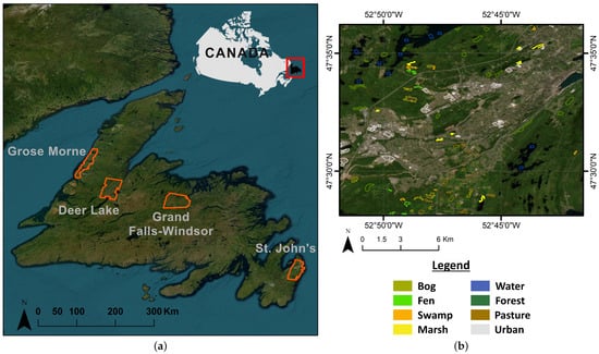 - Mahdianpari, M.; Jafarzadeh, H.; Granger, J.E.; Mohammadimanesh, F.; Brisco, B.; Salehi, B.; Homayouni, S.; Weng, Q. A large-scale change monitoring of wetlands using time series Landsat imagery on Google Earth Engine: A case study in Newfoundland. GIScience Remote Sens. 2020, 57, 1102–1124. [Google Scholar] [CrossRef]
