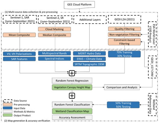 - Secondly, the study utilizes the combined VCH dataset and multi-source EO data to produce wetland classification maps. This step is crucial for investigating the importance of VCH to achieving enhanced wetland mapping.