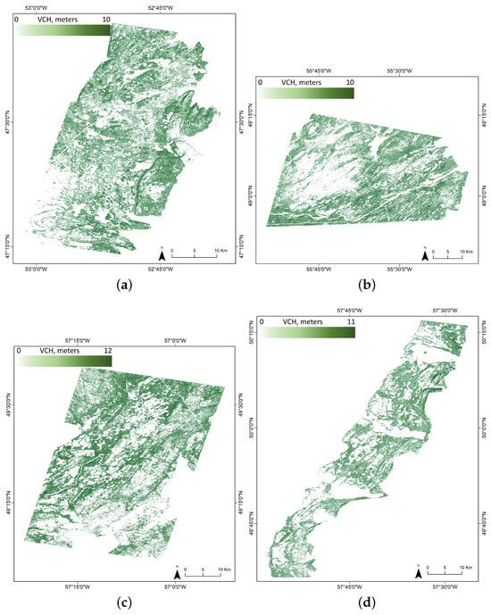 - The ESA has developed a comprehensive global land cover map at a spatial resolution of 10 m, utilizing Sentinel-1 and -2 datasets [38]. This map, known as ESA WorldCover V100, delineates 11 distinct land cover classes based on the classification system of the United Nations (UN) Food and Agriculture Organization (FAO). These classes include tree cover, shrubland, grassland, cropland, build-up, bare/sparse vegetation, snow-ice, permanent water bodies, herbaceous wetland, mangroves, and moss-lichen. Our study utilized the ESA land cover map to mask out non-vegetated regions in VCH maps.
