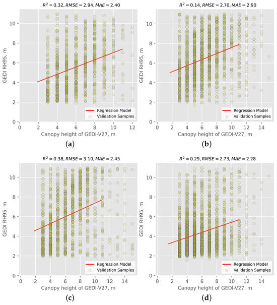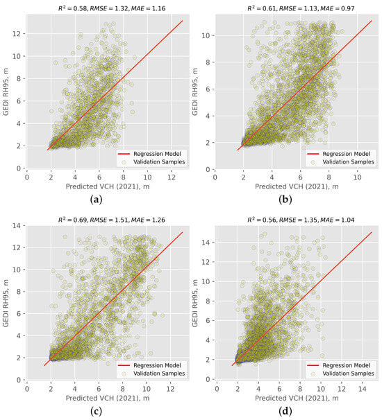 - GEDI points were further screened using a defined threshold and multiple model-runs. Accordingly, the average canopy height was considered as the threshold for filtering GEDI RH metric data, calculated based on the GEDI-V27 product—a global canopy height map available from GEE with a 30 m spatial resolution [39]. GEDI points with a height value greater than twice the determined threshold at each pilot site were excluded from the analysis.