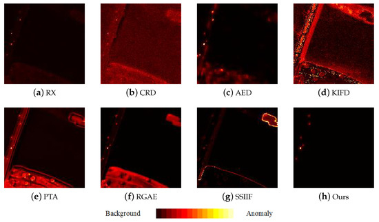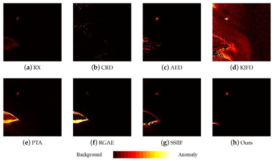 Detection maps of all approaches on Beach dataset. (a) RX. (b) CRD. (c) AED. (d) KIFD. (e) PTA. (f) RGAE. (g) SSIIF. (h) Ours.