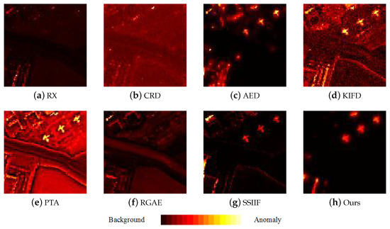 Detection maps of all approaches on Gulfport dataset. (a) RX. (b) CRD. (c) AED. (d) KIFD. (e) PTA. (f) RGAE. (g) SSIIF. (h) Ours.