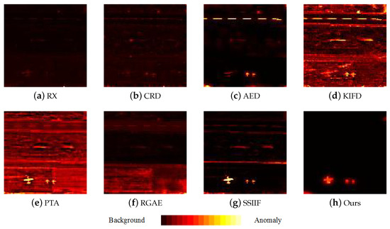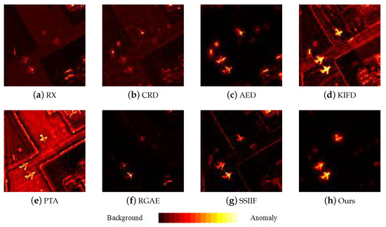 Detection maps of all approaches on San Diego-II dataset. (a) RX. (b) CRD. (c) AED. (d) KIFD. (e) PTA. (f) RGAE. (g) SSIIF. (h) Ours.