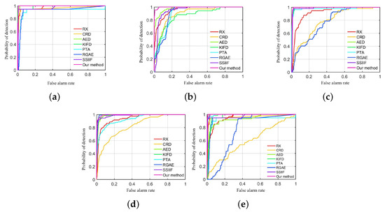 ROC curves of all detection techniques on all datasets. (a) Beach dataset, (b) Pavia city dataset. (c) San Diego-I dataset. (d) San Diego-II dataset. (e) Gulfport dataset.