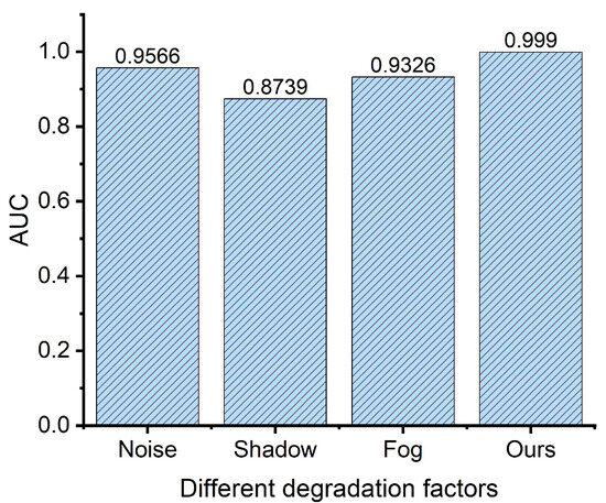 To illustrate the influence of different degradation factors on anomaly detection, an experiment is performed on the Gulfport dataset, in which the input dataset is contaminated with different factors, including Gaussian noise with a variance of 0.1 , shadow, and fog. It should be noted that all the degradation models are from reference [61]. Figure 15 shows the detection results of the proposed method under different degradation factors. It is shown that when the source image is polluted with shadow, the detection accuracy of the proposed method is significantly decreased, i.e., the AUC is decreased by 14.31%. Among all the degradation factors, shadow has a negative impact on target detection performance.