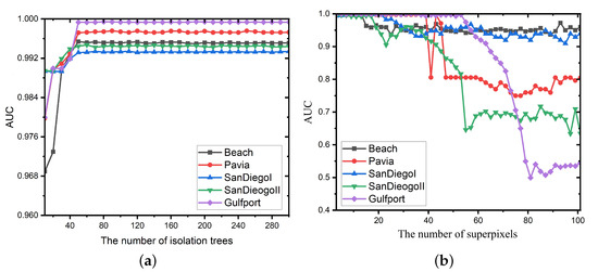 (2) Isolation forest construction: The obtained superpixel HSI is utilized to construct an isolation forest. First, T pixels are initially stochastically chosen from the input data . Then, the chosen pixels are grouped into a left node and a right node according to a simple decision strategy. In more detail, if is lower than the split value , the t-th pixel is grouped into the left node. On the contrary, it is grouped into the right node. Here, s denotes a random number from 1 to D. The split threshold is randomly chosen between the minimum and maximum of . Next, each child node is further segmented with the same operation above iteratively, until one of the following nether conditions is required: (1) the pixels in each child node are consistent; (2) the amount of pixels in each child node is 1; (3) the number of tree comes up to the maximum height . In this paper, . At last, the procedure steps of the isolation tree are iterated q times to form the isolation forest.
