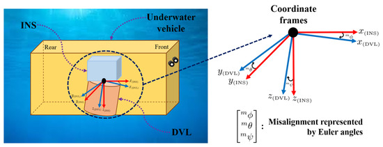 The misalignment of INS and DVL indicates the rotation of the DVL coordinate frame relative to the INS coordinate frame. In INS/DVL fused navigation, the velocity measured by the DVL is converted to the velocity in the INS coordinate frame using the rotation data of the DVL coordinate frame relative to the INS coordinate frame. If the coordinate frames of the INS and DVL are the same, the velocity measured by the DVL is identical to the velocity relative to the INS coordinate frame Any unknown misalignment between these two coordinate frames causes velocity errors, resulting in navigation errors. The degraded navigation performance affects the operational accuracy and stability of underwater vehicles during missions. Additionally, in a complex underwater environment with disturbances such as currents, waves, and tidal changes, the sensor output is affected to a greater degree; thus, the error increases further, and INS/DVL fused navigation deteriorates. In our research, rotation and attitude have the same kind of data representation and will be used interchangeably in the context of arithmetic operations.