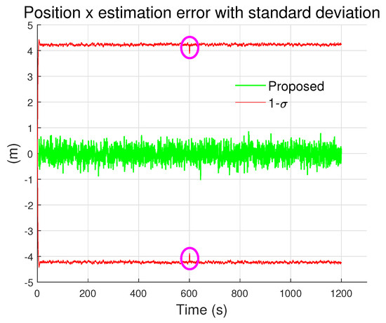 43) for the estimated x coordinate. The position estimation error remains within the standard deviation for the entire range. In addition, the standard deviation is kept within a bounded range, and does not diverge. At time