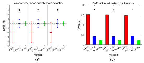 x-direction without compensation of misalignment (Q-EKF) is −0.9521 m, and it is improved to −0.0109 m by the proposed method. The RMS of
