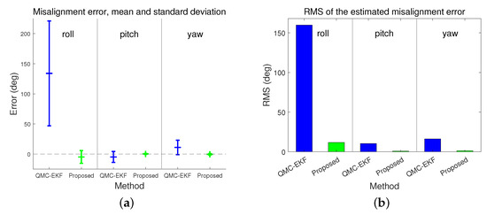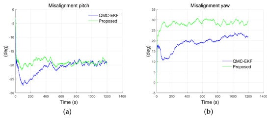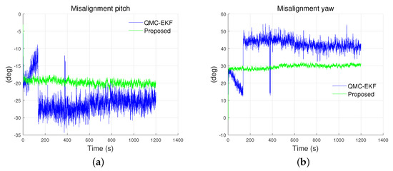 Figure 11 illustrates the estimated results for the misalignment in the pitch and yaw. The proposed method provides a better estimation of misalignment than the QMC-EKF. Specifically, the misalignment in pitch is estimated as −19.0503° and −20.9881° by the proposed method and the QMC-EKF respectively. As for the misalignment in yaw, the estimations are 28.2626° and 19.0502° by the proposed method and the QMC-EKF respectively. Furthermore, the error by the proposed method has less standard deviation and RMS than the QMC-EKF. The RMS of the error in yaw misalignment estimation is 2.2311° and 11.4136° by the proposed method and QMC-EKF respectively. Overall, the proposed method exhibits improved estimation for the estimation of misalignment.