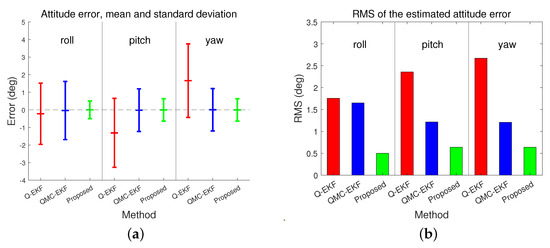 Table 3. The proposed method exhibits improved estimation for both the attitude and misalignment. Unlike Q-EKF, QMC-EKF and the proposed method explicitly estimate the misalignment and compensate for the misalignment. However, QMC-EKF regards the attitude and the misalignment as the variables in a linear space. Therefore, QMC-EKF uses the usual arithmetic operations by which linear variables are treated. These operations result in approximations and require ad hoc normalizations. On the contrary, the proposed method uses Lie theory which provides rigorous arithmetic operations required to implement the Kalman filter. The improvements in estimation accuracy and stability conform to the theoretical verification [