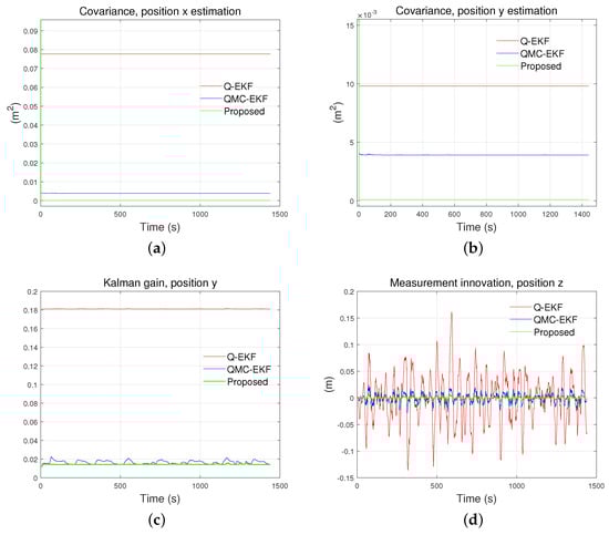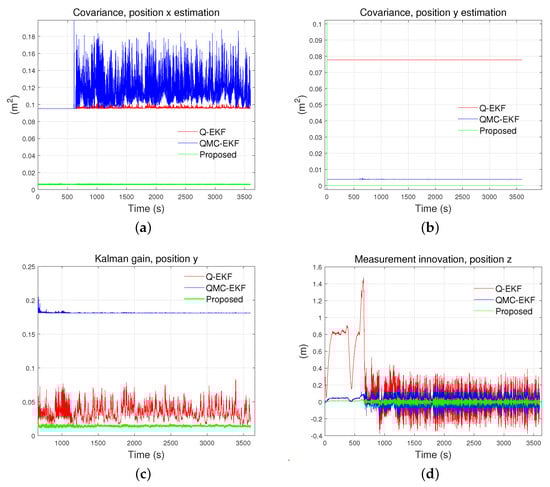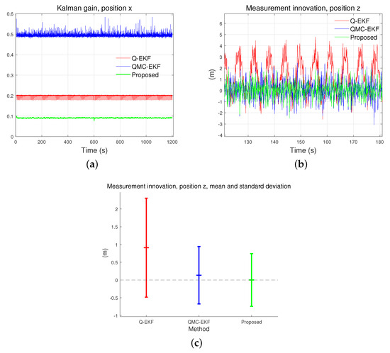 Figure 9 compares the Kalman gain and measurement innovation of the methods. They are calculated by using Equations (