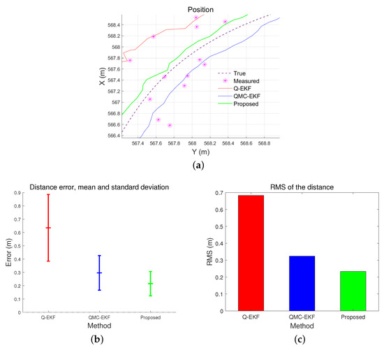 x-direction error is improved to 0.2269 m by the proposed method from 1.5314 m by the Q-EKF. The results confirm that the proposed method estimates the trajectories more accurately than the other approaches.