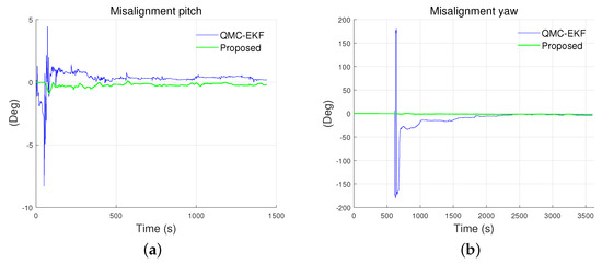 Table 3, QMC-EKF exhibits unstable estimates in both pitch and yaw. On the contrary, the proposed method improves the estimation of misalignment and provides stable misalignment value. The proposed method estimates the misalignment in pitch as