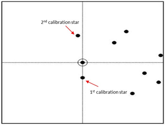 - Multi-calibration star selection: experimental data from reference [27] indicate that, in real star images, merely 9.6% of primary stars have two nearest neighboring stars that are inconsistent with those of the navigation star database due to noise interference. This is much lower than the inconsistency with the nearest neighboring star. In order to improve the reliability and robustness in pattern construction, the two nearest neighboring stars to the primary star in the captured star image are chosen as the calibration stars, as shown in Figure 2. Then, pattern matching is successively performed based on these calibration stars.