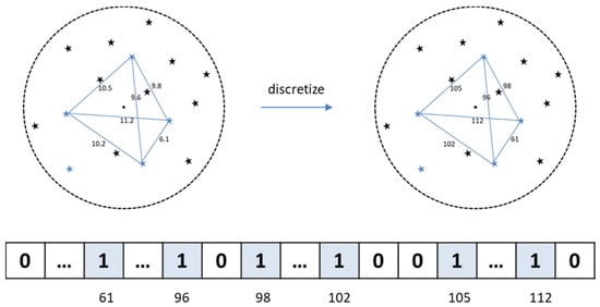 Step 5: calculate the angular distance data among the 15 brightest neighboring stars and then discretize these angular distances. Assign the value of the index corresponding to the discretized distance to 1 in the NSDFV. As shown in Figure 4, the discretized distances between the stars are 61, 96, 98, 102, 105, and 112. As such, the 61th, 96th, 98th, 102th, 105th, and 112th elements in the neighbor star angle distance vector are set to 1. In this paper, the length of NSDFV is set to 200, namely, the discretized distances unit is set to 0.01°.