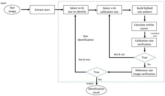 Figure 7 shows the flowchart of the proposed star identification algorithm based on hybrid grid patterns. This includes three primary steps: hybrid grid pattern matching, calibration star filter, and reference star image verification. The first two steps belong to the initial matching stage, while the third step belongs to the validation stage of the framework shown in Figure 3.
