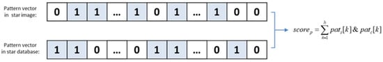 Specifically, the nearest-neighbor star to the primary star is selected as the 1st calibration star. Subsequently, the similarity score between the hybrid grid pattern generated using the 1st calibration star and the hybrid grid pattern stored in navigation database is calculated as illustrated in Figure 8, where is the similarity score between the observation pattern vector in the star image and the pattern vectors in the navigation database and it can be calculated using fast shift and logical AND operation. The navigation stars whose similarity scores are higher than those of the pattern-matching threshold are considered to be candidates. If no navigation stars have similarity scores higher than , then the 2nd nearest-neighbor star is selected as the 2nd calibration star and the abovementioned process is repeated.