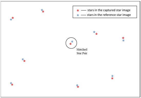 The camera attitude can be estimated using the TRIAD [28] algorithm once the initial match result is determined. Then, a simulated star image under attitude can be generated by combining some camera parameters and the star catalog. It is defined as a reference star image. These only offer star position coordination to accelerate verification step. As shown in Figure 9, red stars represent the locations of stars in the captured star image, and blue stars represent the locations of stars in the reference star image. If the initial match result is correct, then stars’ coordination in the reference star image is close to the corresponding coordination of stars in the captured star image (for example, blue circle indicates a matched pair of stars between the captured and reference star image), and matched star pairs are output as the final identification results of the algorithm. Otherwise, the initial match result is incorrect.