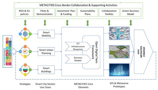 As a result, the forthcoming era of city and regional development, coupled with digital transformation, necessitates an approach that involves concurrent planning, construction, and operation of both the digital and physical facets of a city. METACITIES [,] envisions a strategic direction to establish an Excellence Hub, supported by a novel framework and a pioneering digital agenda. This approach harnesses the potential of emerging technologies, empowering interconnected entities, including companies, research institutions, governmental bodies, and societal actors, to mutually reinforce one another and collectively elevate the landscape of innovation in smart cities and regions.