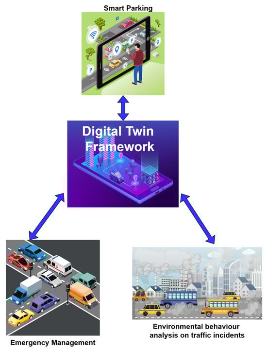 Digital twins emerged as a prominent inclusion in Gartner’s top 12 strategic technology trends for 2022, as part of autonomic systems []; projections suggest that “By 2027, over 40% of large organizations worldwide will be using a combination of Web3, spatial computing and digital twins in metaverse-based projects aimed at increasing revenue” []. The World Economic Forum’s release of an insightful report on the framework and global practices for Digital Twin Cities [] and the National League of Cities’ report on Cities and the Metaverse [] underpin the significance of digital twins as a pivotal element in smart cities. These reports underscore how digital twins facilitate the development of virtual replicas of physical assets, sensors, systems, and processes. Moreover, they highlight the potential transformative impact of digital twin frameworks on smart cities, envisioning a seamless integration between the physical and digital realms.