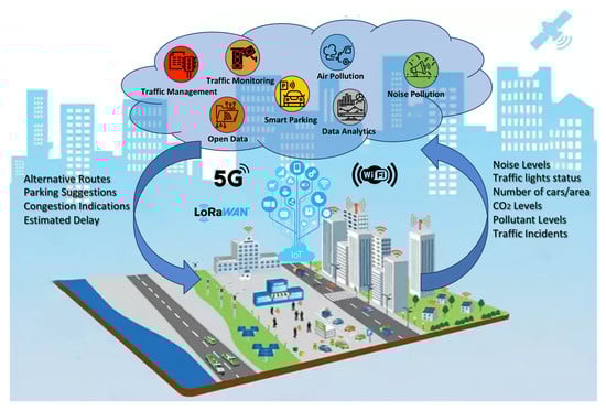 In Europe, the city of Barcelona, Spain, has implemented as part of the 15-minute city initiative an innovative smart mobility system that integrates digital twins to optimize transportation networks and improve urban mobility []. By deploying a network of sensors, cameras, and IoT devices across the city’s transportation infrastructure, Barcelona collects real-time data on traffic conditions, parking availability, and public transportation usage. These data are then fed into a digital twin, a virtual replica of the city’s transportation system. The digital twin continuously updates itself based on the real-time data, allowing city officials to monitor the current state of the transportation network accurately. Advanced analytics and AI algorithms are applied to the digital twin to gain insights into traffic patterns, identify congestion hotspots, and predict future mobility challenges. Using the digital twin, Barcelona’s transportation authorities take proactive measures to optimize traffic flow and enhance mobility: