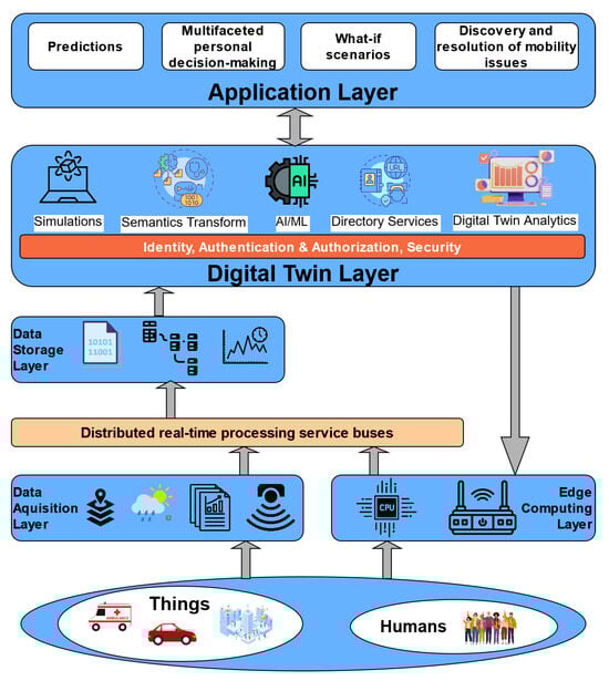 Aiming to support all the use cases for Smart Mobility, as shown in Figure 3, we propose an overall architecture, as shown in Figure 4. The architectural diagram is high-level and depicts the initial blocks and requirements for the METACITIES architecture that can support the specific DT use cases. Layers are cleanly separated, with each serving clear purposes.