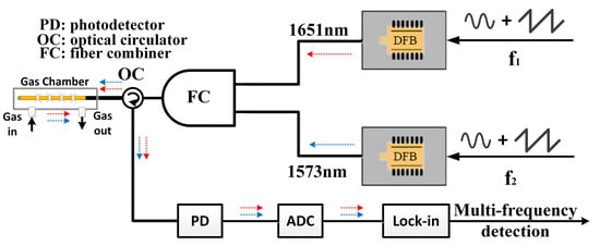 In consideration of the HC-PBF fiber gas cell application, the absorption lines selected for CH4 and CO2 should be in the operation wavelength range from 1490 nm to 1680 nm. Therefore, the CH4 absorption targeted line selected is around 1650.9 nm which is a typical absorption line for CH4 detection. Within this absorption wavelength range, the common interference gases like CO2 and H2O are at least three times weaker than CH4. When the absorption effect of interference gas is very low, this effect is able to be effectively suppressed by signal processing codes based on FPGA. Similarly, the selected absorption lines of CO2 are around 1573 nm. The absorption strength ratio between CH4 and CO2 is nearly 80 which matches approximately the concentration in the atmosphere. In addition, before pumping into the gas chamber, the gas will undergo drying treatment to ensure that the water vapor concentration is not sufficient to affect the detection results. Upon the above design and analysis, the error caused by the interference gas has no effect on the detection precision of CH4 and CO2 in the selected absorption ranges. Detailed information on selected absorption wavelength ranges is shown in Figure 3.