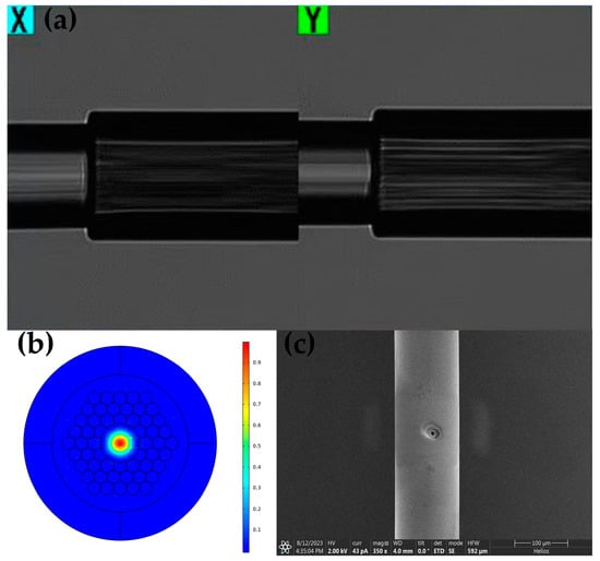 (a) SEM image showing the fusion end, (b) distribution of the fundamental mode in the HC-PBF, and (c) SEM image displaying the surface of the drilled hole.