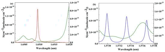 (a) Gas absorption spectrum of CH4 at 1651 nm, the red and green lines represent CH4 and H2O absorption lines, respectively; (b) gas absorption spectrum of CO2 at 1573 nm, the blue and green lines represent CO2 and H2O absorption lines, respectively.