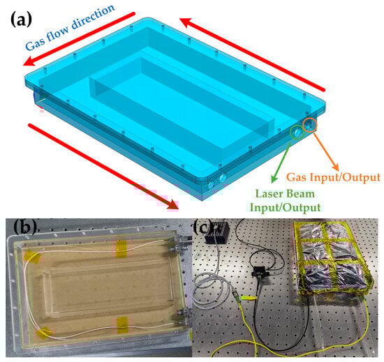 The HC-PBF fiber is an exposed fiber with drilled holes. Due to the absence of protective armor, the operational state of the HC-PBF fiber is susceptible to external factors such as vibrations, temperature fluctuations, and airflow. These unpredictable interferences can significantly impact detection results. To mitigate this, a self-designed mechanical protection chamber has been developed and implemented. This chamber serves to shield the HC-PBF fiber from external influences and maintain a stable environmental condition conducive to reliable operation. The mechanical structure of the protection chamber is depicted in Figure 4. The chamber structure is primarily rectangular, with the HC-PBF fiber arranged along the inner wall. Figure 4a shows the design drawing of the mechanical structure, while Figure 4b presents an image of the chamber. The chamber’s central region is filled to minimize internal gas volume, allowing for the pump in of external gases through air vents. Considering the sensitivity of the detection system to environmental temperature fluctuations, thermal insulation is applied to the chamber, as illustrated in Figure 4c.
