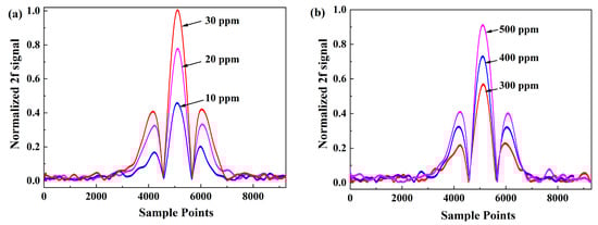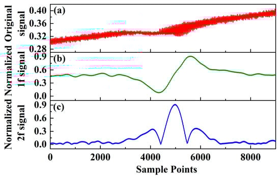 To evaluate the sensor’s performance, sample gas mixtures of known concentrations are generated by diluting 500 ppm CH4, 2000 ppm CO2, and pure N2 using a commercial gas dilution instrument. With an absorption length of 1.78 m for the HC-PBF, the waveform is saved and observed using a self-developed CPU based on an FPGA chip. The observed original signal is depicted in Figure 5a. The processed 1f and 2f signals are displayed in Figure 5b and Figure 5c, respectively.