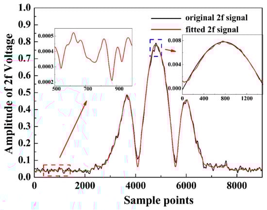 The signal-to-noise ratio of the demodulated 2f signal, without subsequent algorithm optimization, directly determines the system’s detection performance. The standard deviation, approximately 0.327 mV (1σ), was determined within the non-absorption range. There is an inevitable fluctuation in achieving the peak value of the 2f signal. To obtain an accurately related 2f amplitude signal, the 2f signal is fitted before being recorded.