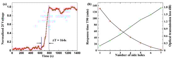 A specialized experiment was conducted to assess the optimal values for the number of holes and response time. With an increase in the drilled hole count, the corresponding energy loss and response time were recorded. During the experimental process, the protective chamber was purged with pure N2 to prevent operational errors stemming from external pressure differences. Dynamic gas distribution was employed instead of static injection distribution for this purpose. In the response experiment, methane was used as the sample, and the amplitude of the 2f signal was recorded every second. The results for the response time are depicted in Figure 7a. When the number of drilled holes was increased to seven, the response time decreased to less than 3 min, meeting the requirements for many applications such as precision agriculture and industrial pollution gas detection. Specifically, the decrease in response time exhibited an almost exponential relationship with the number of drilled holes, as illustrated in Figure 7b. Overall, a noticeable reduction in response time resulting from an increased number of drilled holes aligns with some previous findings (e.g., ref. [19]). Discrepancies between our experimental results and reference papers may arise from factors like the total length of the microchannel, the drilled hole placement, and machining errors in their creation. Moreover, for the sake of faster response, each drilled hole consumes approximately 0.2–0.3 dB, implying a trade-off between energy loss and response speed.