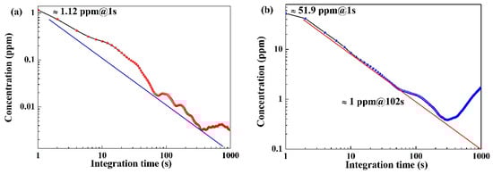 Allan deviation analysis of the sensor system based on one-hour measurements in a pure N2 atmosphere concentration of (a) CH4 and (b) CO2.
