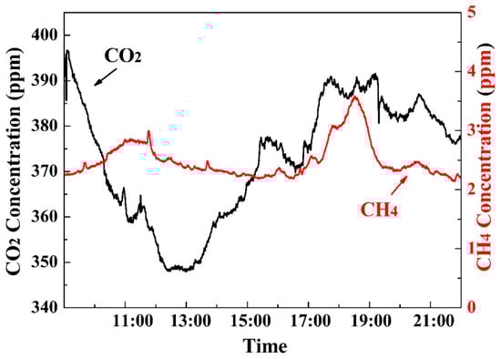 An on-situ test was conducted in a rice field located in Jilin Province, a city in northern China, a typical source and sink for greenhouse gases. Before the on-situ test, a comparative test with a G2401 was carried out to ensure the varying concentrations of water vapor would not influence our test results. Since the experiment took place in October, the selected rice plants were at a mature stage, reaching a height of over 1.2 m. The sampling location was near the roots of the rice field to monitor the greenhouse effect within the group of rice plants. As illustrated in Figure 10, the measured CH4 concentration was slightly higher than the average atmospheric concentration, which was marginally lower than the anticipated concentration. The most probable reason is the decreased activity of methanogens in the mature-stage rice plants. Meanwhile, the cultivation method of mature rice is not a flooded mode, which significantly suppresses the generation of CH4 from rice fields. In contrast, the concentration of CO2 primarily aligned with photosynthesis, indicating satisfactory detection performance. Moreover, the rice field was an outdoor open structure, and the detected gas concentrations were influenced by environmental factors such as wind speed and human activities, contributing to the fluctuations and ripples in the detection results.