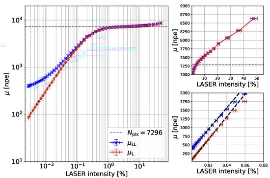 Mean values of Laser only (red) and Laser plus LED light (blue) versus Laser intensity. The two zoomed-in inserts are the high- and low-intensity regions at linear scale, respectively. The measurements are taken at 20 °C with zero time delay between LED and Laser light. The SiPM is operated at an overvoltage .