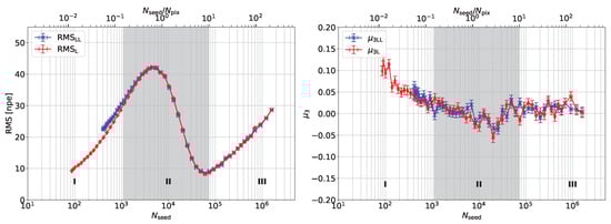 RMS values (left) and skewness (right) of Laser only (red) and Laser plus LED light (blue) versus the mean number of seed photons between Laser and Laser+LED for each measurement step. The Laser+LED data set is shifted on the x-axis by the value of compared to the Laser one. The measurement conditions are the same as in Figure 3. Three regions are marked for discussion: (I) linear response within ±5%, (II) non-linear response, which can be recovered with the method discussed in this paper, (III) non-linear response which cannot be recovered.