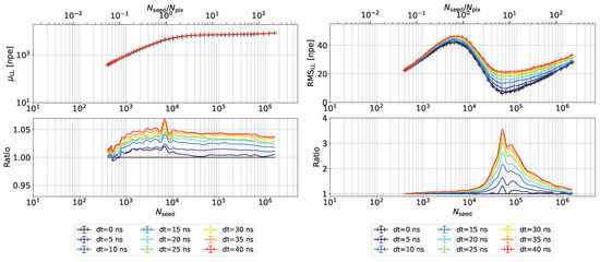 In Figure 5, late-arriving LED light increases both the mean and the RMS of the collected charge distributions compared to synchronous light sources. The largest deviation occurs when the number of seed photons is roughly equal to the number of pixels. The differences in the mean are below 5% up to a time delay of for roughly 300 photons from the LED. The RMS increases by a factor of up to 3, most likely due to the large fluctuations in the pixel recovery status at the time of the second photon detection in a single pixel.