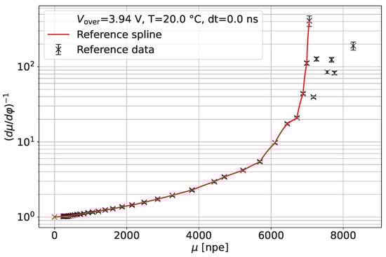 The reference non-linearity curve for the SiPM under study operated at T = 20 °C, V, and for ns using an integration gate of 100 ns is presented in Figure 6. The x-axis is the mean value of and . The data are smoothed by a linear spline function. This function is used in the rest of the paper to correct data from the same SiPM operated in different conditions.