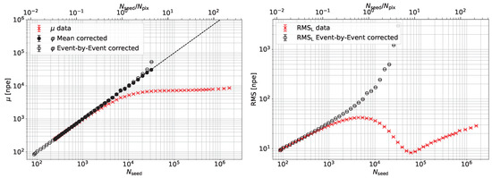 The corrected SiPM response obtained using Equation (7) on the data presented in Figure 3 is shown in Figure 7. Two methods to apply the correction are shown: correction of the mean of a set of data at equal light intensity and the correction event by event of each measurement. In both cases, the linearity of the corrected data is improved. The right plot shows that, after event-by-event correction, the RMS of the charge response scales as expected with up to a point where the data are slightly overcorrected.