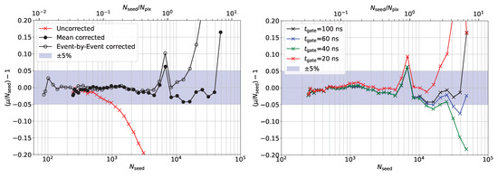 In the left plot of Figure 8, the response linearity is plotted by subtracting a slope of one from the data of Figure 7. The uncorrected data diverge from linearity by more than for ∼. The mean corrected data stay within of linearity up to 45,000∼, excluding the single outlier at ∼. If the linear dynamic range is defined as the min-to-max range in which the SiPM response is linear within , the correction increases the linear dynamic range by a factor of ∼45.